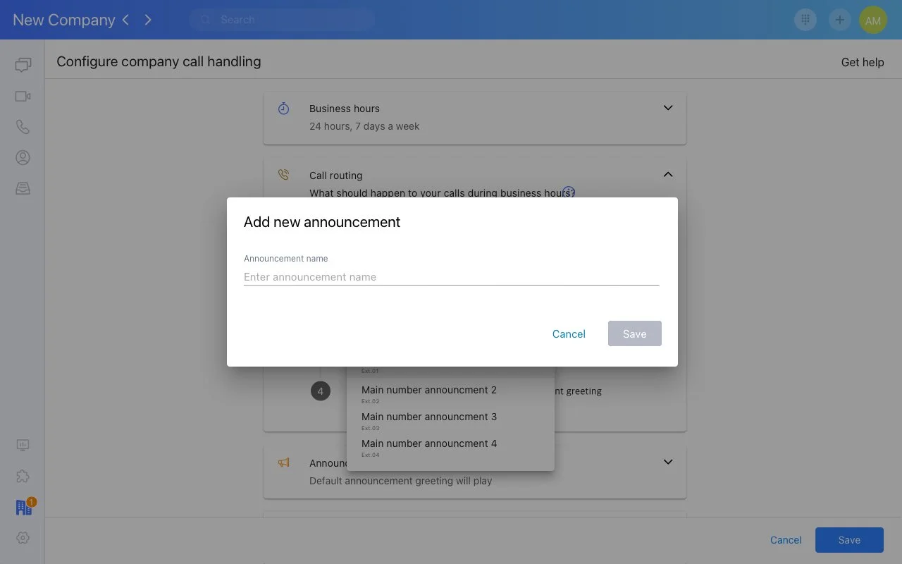 Creating a new announcement in RingCentral’s call routing settings. Users can name and configure an announcement that callers will hear when they reach the company’s main number.